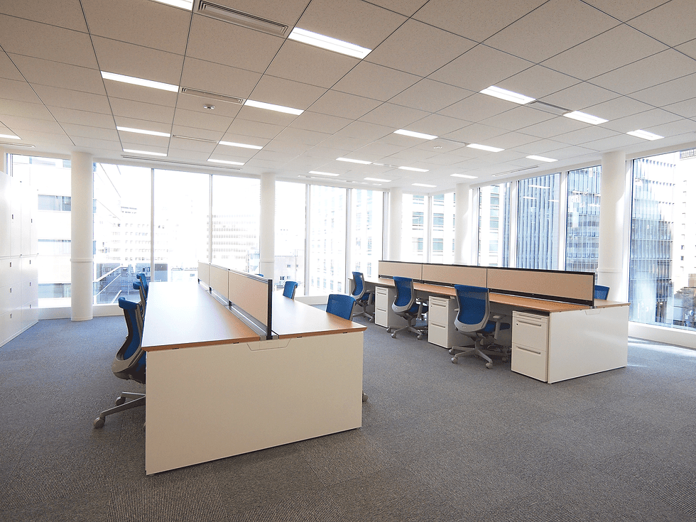 テナント区画は開放的な2面全面採光により、明るく差し込む自然光がフロア全体に行き渡る特徴がある。この自然光を 生かすためワークスペース、ミーティングスペース、応接室、エントランスの効率的なレイアウトには特に配慮した。ワー クスペースとエントランスは間仕切りをなくし、シームレスな空間とすることで快適で機能的なオフィス環境を創出した。